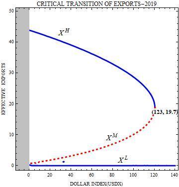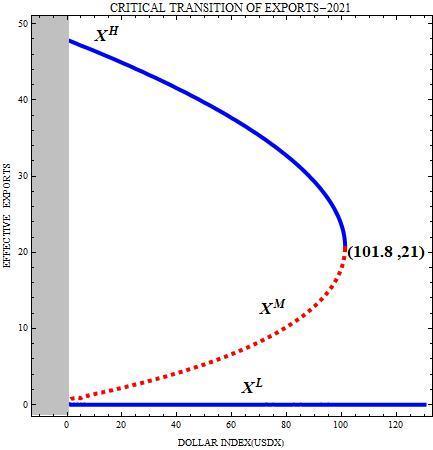 Results show that the system is highly affected by United States dollar index variation and proximity indices between the product regardless of other parametric values such as intrinsic growth rate, Carrying capacity, alee effects, and half saturation contact. The system will exhibit high resilience H x as critical transition values of the United States dollar index become larger or the proximity index become smaller than the data-based values United States dollar index and Proximity index.