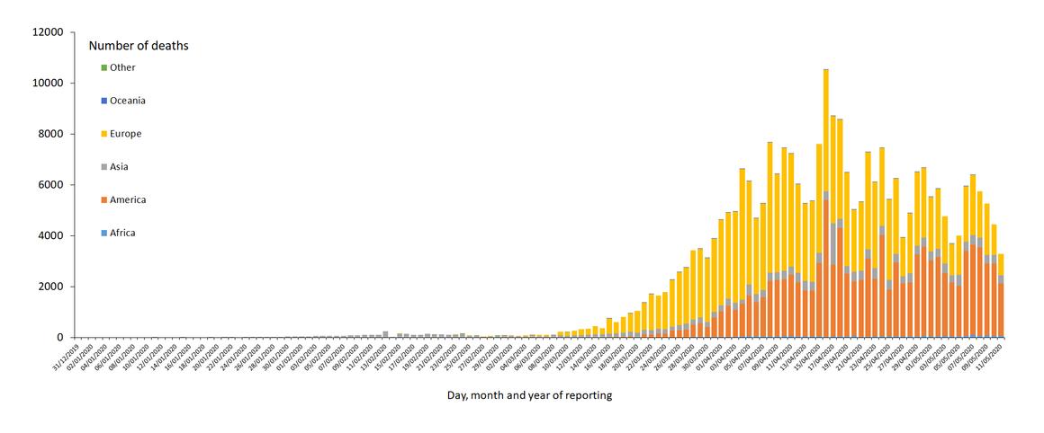 FIGURE 2: Distribution of COVID-19 deaths, worldwide, as of 11 May 2020 [32]