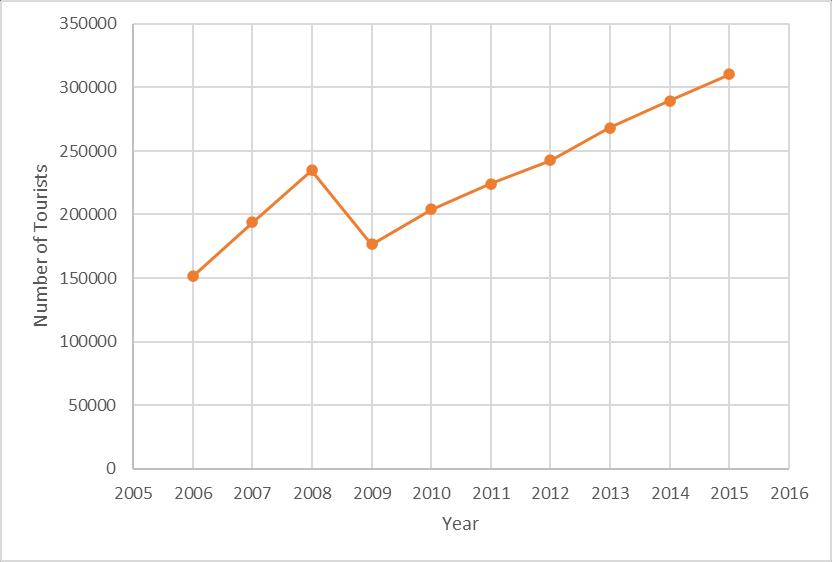 Thiruvananthapuram accounts for a major share of the tourists visiting Kerala. The foreign tourist arrival to Thiruvananthapuram over the period 2006-2015 is shown in Figure 1. It can be seen that the foreign tourist arrivals to Thiruvananthapuram have been growing every year except for a blip in 2009, which could be attributed to the global recession [14]. Thiruvananthapuram is also a major attraction for domestic tourists.