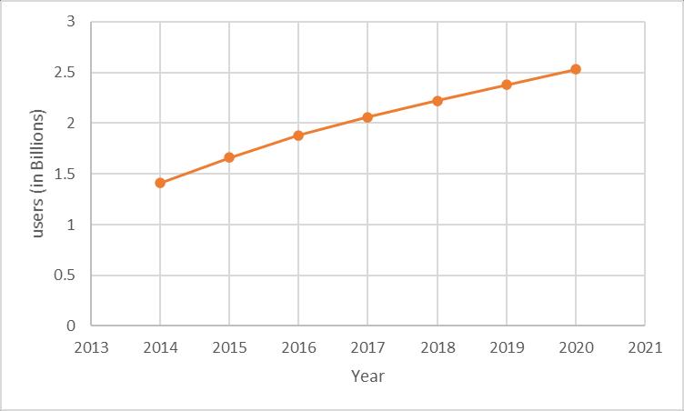 The average mobile internet usage all over the world has also increased from 1.5 hours to 2 hours a day over the past 4 years. Studies have also projected that almost 1/3rd of the global population, that is 2.34 billion people, will be using social media this year. The following figure shows how social network usage has been steadily increasing while the percentage of internet usage has stagnated over the years.