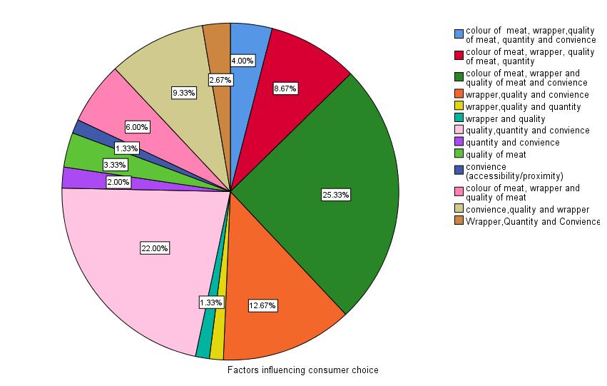 Consumers who always consider packaging of the product before buying linked quality of packaging to product quality. This shows that packaging adds value to product appearance and acceptability by majority of the consumers. Majority of the respondents confirmed that they are mostly influenced by the wrapping nature (packaging) of a product. Most consumers were not happy with the packaging of open market meat and meat products. They consider it a deviation from good packaging and do not allow consumers to know the source of the product. Buying certain products which hitherto are not planned for as a result of attractive nature of the package was not found among the open market consumers. Respondents in the open market described convenience of meat they buy with regards to handling, transporting and the retailer appearance. These attributes attract them and convinced them to purchase and used such products.