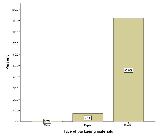 Majority (92%) of the packaging materials used in the open market were plastic type. Paper materials were the next type (7.3%) and the least (0.7%) used packaging materials in the open market was metal type (Figure 1). Levy (1993) found that about two thirds of foods and beverages were portion-packaged in plastics and most common types of plastics used were low-density polyethylene, high-density polyethylene, polyethylene terephthalate, polypropylene and polystyrene. The materials used are influenced by its cost and accessibility by the retailer. Also consumers sometimes recommend
