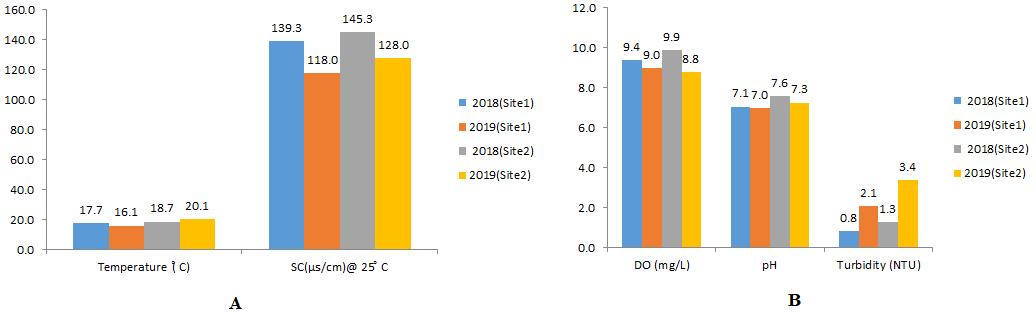 In year 2019 , from the values that have been given SC at site 2 is higher in values than site1 between all locations (see table1). The higher number of SC clarifies that the water has contains too many substances. These conductive ions come from different sources such as organic matters, salt and Do. Based on the obtained data site 2 has more capability to pass electrical current due to the fact that can be largely attributed to the runoff of agricultural land and nearby livestock fields, as well as the active agriculture activities. In addition, the runoff will significantly contribute to loading a variety of nutrients and ions, which will lead to the increase the SC (Hucks et al., 2009). Similar pattern, have been shown in the year 2018 which the SC was high again at site2 (see bar chart.1). This is maybe due to the human activities surrounding site2 which has putted external burden through the flow of the river.