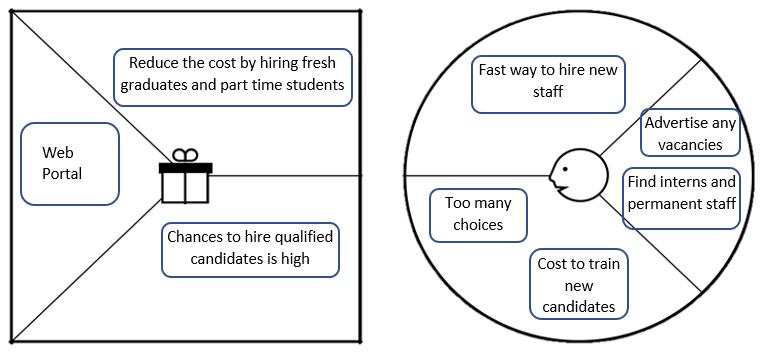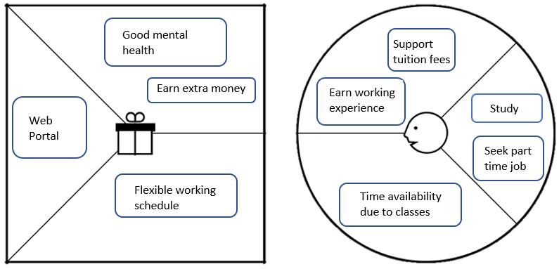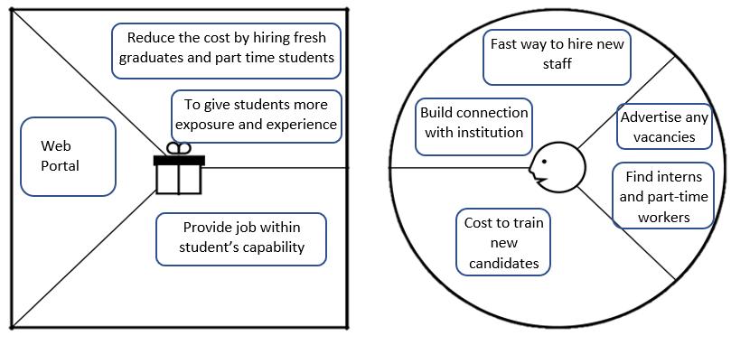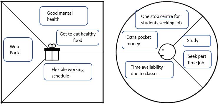 The value proposition defines as the values of the project promise to deliver B40 students, alumni and employers should they choose to use this platform to seek employment. The benefits that offered include a One-stop centre for the student, support tuition fee, gain experience; consult for reference, maintain the connection with the institution, provide a hiring platform and seek new intern/part-time. The values that have been added to the value proposition can help students to find new jobs and solve financial problems. Besides, students gain some knowledge, experience, and skills so that they are expected to get decent jobs. Moreover, this project aims to reduce poverty by providing jobs to students and society.