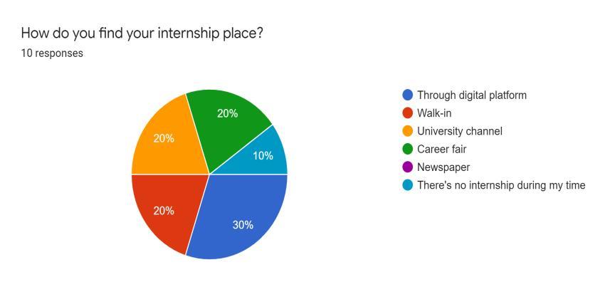 For the second questions, the alumni were asked how they found their internship place. Around 30% of the alumni found their internship place through a digital platform. There are about 3 sectors with 20% which is a total of 60% found their internship place through a career fair, walk-in interview, and through university channel and the 10% of the respondents respond that there was no internship during their time.