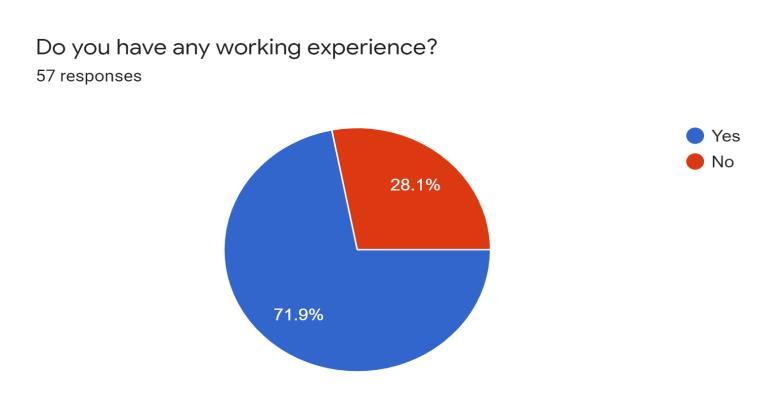 For the second question, the pie chart shows that the majority of the students possess working experience with 71.9% and 28.1% did not have any working experience at all.