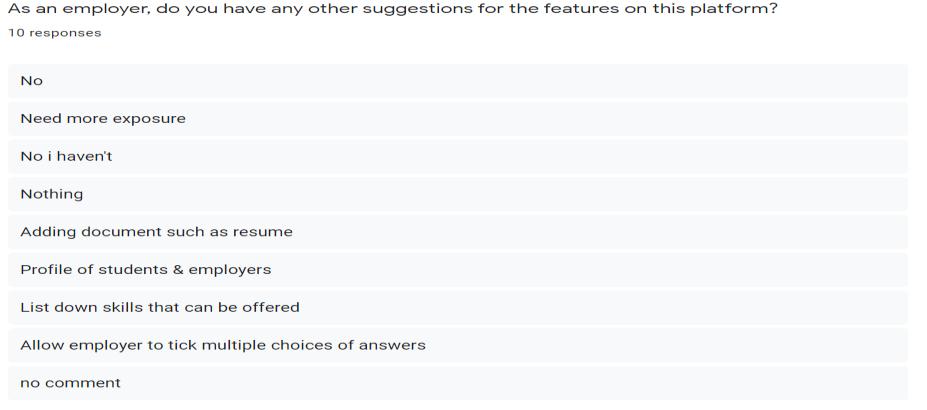 In this last question, we asked employers if they have any suggestion of features to include in this platform. One of the respondents suggested listing down the skill that can be offered and other than that, other respondents suggested adding documents such as resumes to ease employers to view students' profiles. While others did not have any suggestion to be added.