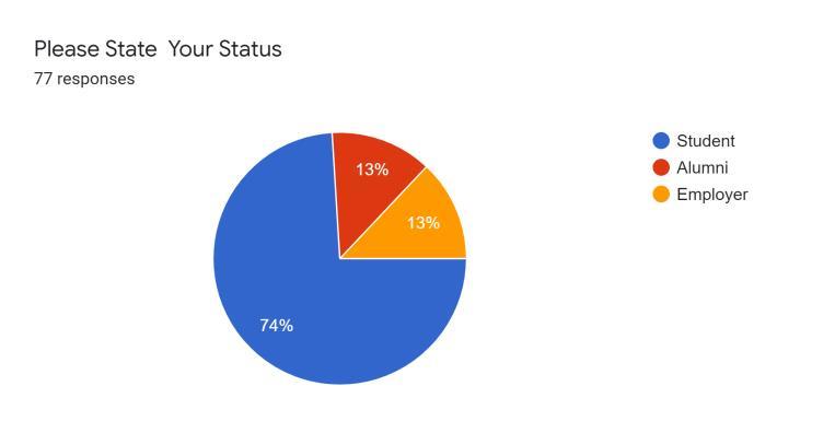 The survey conducted using an online survey method to validate the business case and the survey conducted through a google form. For the first question, we asked them their status to identify which customer segment they belong to, and 74% of the respondents are students while for alumni and employers are 13%.