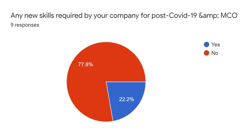 Moreover, the employer was asked if there are new skills required by their company for post-Covid-19 MCO. The majority of the employers (77.8%) said that there is no need for new skills for their company and the rest (22.2%) said they need new skills for post-Covid-19 MCO.