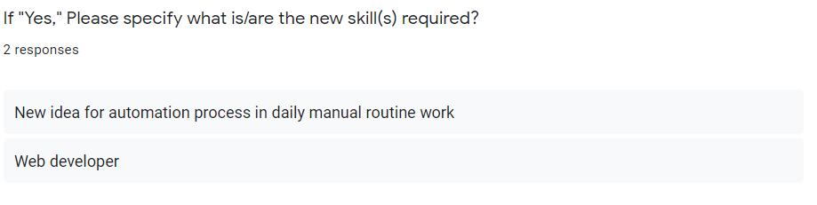For this question, if the employers said yes then what are the new skills required for them. Based on the responses, the employers would suggest the new idea for the automation process in daily manual routine, and the second one they suggest that the skills needed are web development.