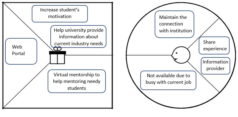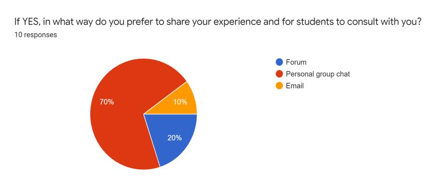 Furthermore, the alumni were asked which platform they would choose to share their experience with students. The pie chart displays the platform they would use and about 70% alumni choose to use personal group chat while another 20% choose forums and about 10% choose email as a medium to consult with the student.