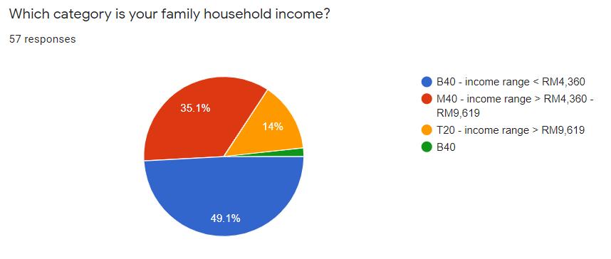 In this survey, we asked the students which category of their family household income. Approximately, half of the respondents come from B40 household income. 35.1% comes from the M40 category and 14% comes from T20 household income.