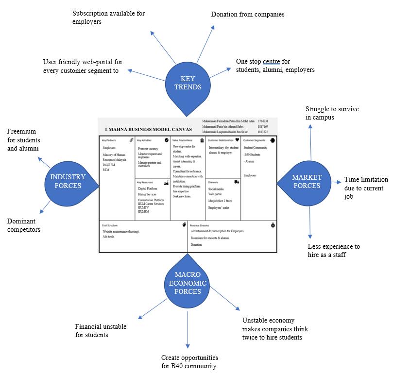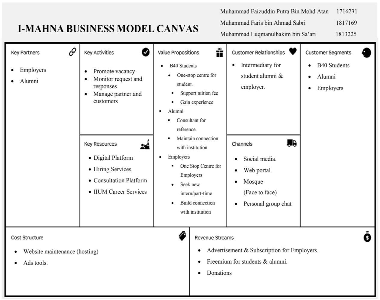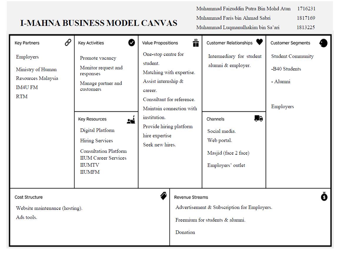 Key resources are the crucial assets required to deliver the value propositions to customer segments. The key resources include digital platform, hiring services, consultation platform, IIUM career services.