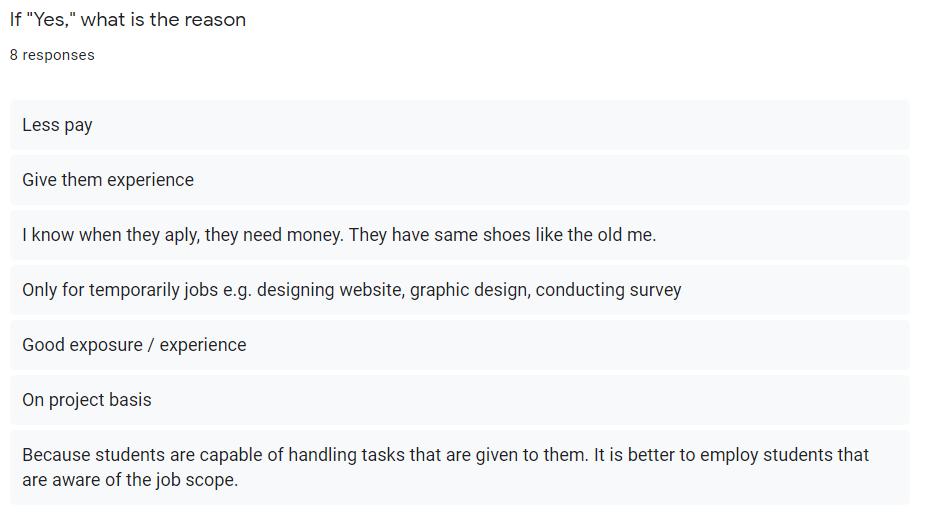 This question is related to a previous question where we ask employers whether they prefer to employ students as parttime workers or not. 8 out of 10 respondents prefer to employ students as part-time workers. One of the respondents commented that students are capable of handling a task and students are more aware of job scope. Some of the respondents prefer to employ because to give them some experience and less pay. In addition, they employ students only for temporary jobs.