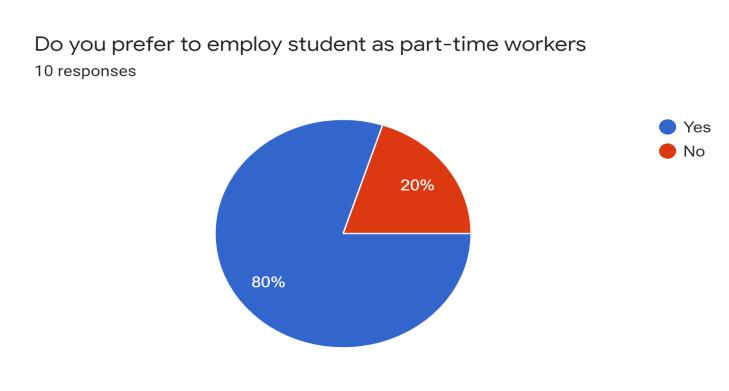 This section is specially addressed to the employer and the employer was asked whether they prefer to employ students as part-time workers. From the pie chart, it indicates that most of the employers said they would employ the students with 80% of the percentage and the remaining 20% of them were not interested to employ students as part-time workers.