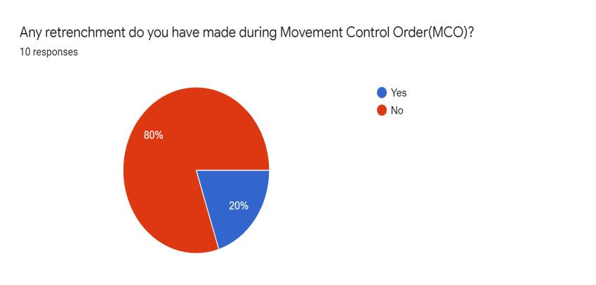 We asked the respondents whether they have made any retrenchment of staff due to the Movement Control Order(MCO). 80% of respondents have not retrenched any of their staff due to Covid-19 crisis. The rest of per cent decide to retrenched their staff during MCO.