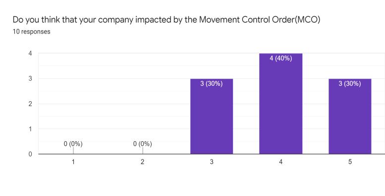 In this question, we ask for employers to rate from scale 1 to 5 whether their company is affected by MCO. 10 out of 10 respondents state that their company got impacted by Movement Control Orders(MCO).