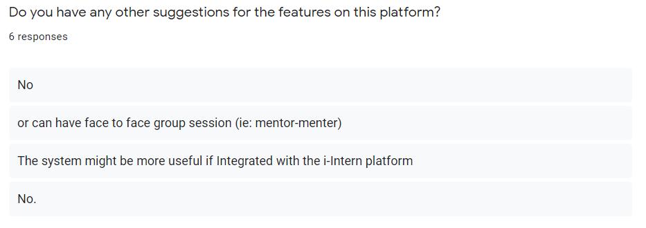 In this question, we ask alumni to add any suggestion features on this platform. One of the respondents suggested having a face to face group session and another respondent suggested integrating it with an i-intern platform. While others do not suggest anything.