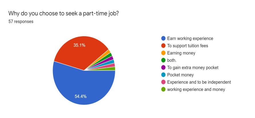 For the third question, we ask about what is the reason for respondents to seek part-time jobs. The majority of respondents choose to seek a part-time job because to earn working experience. More than one-third of respondents seek part-time jobs to support tuition fees. The rest of the respondents choose to earn more pocket money.