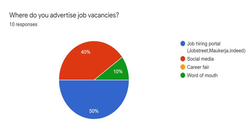 This question we ask the employer where they advertise the job vacancies. Half of the employers choose job hiring portals to publish their job vacancies. While 40% of respondents choose social media and others prefer word of mouth.