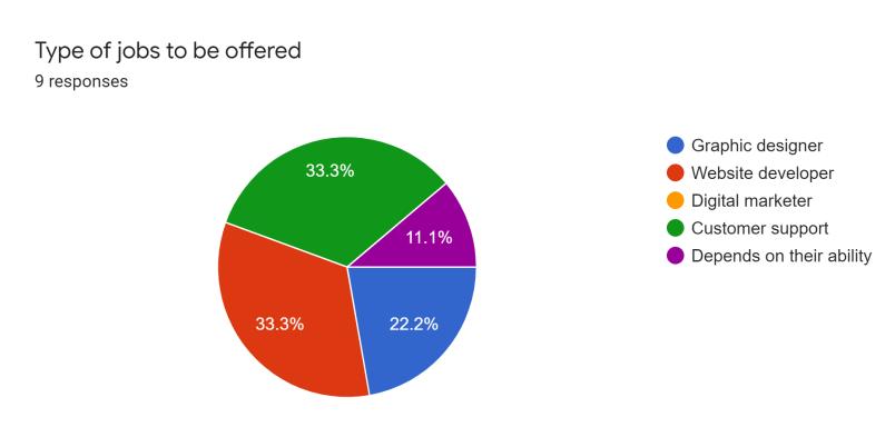 For this question, the employer was asked what job they would offer if they hire students as part-time workers. Based on the pie chart below, about 2 sectors with 33.33% which is a total of 66.6% of would offer students to be their website developer and customer support while 22.2% of the employers would offer them to be a graphic designer and 11.1% would say it depends on the student’s ability.