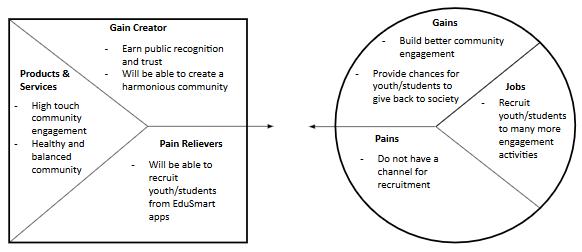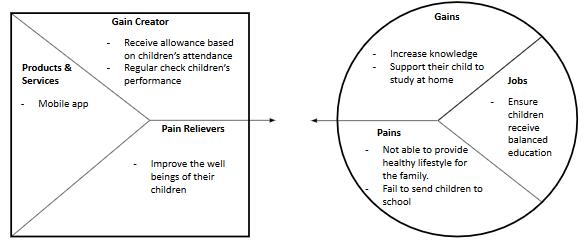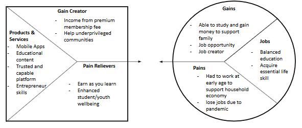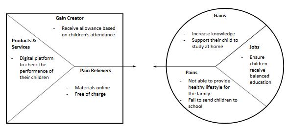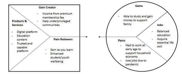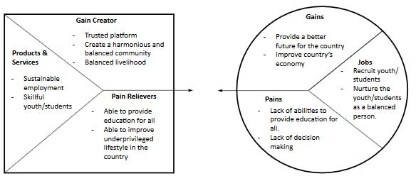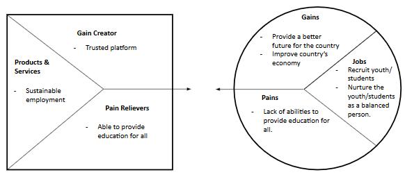 The value proposition defines the value of the project to the Customer Segments. The term "earn-as-you-learn" is implemented as B40 parents will be given an allowance if their family member's school and IHLs attendance meet a certain percentage. A trusted and capable platform will be created for B40 youth or students in order to give a balanced education to the youth and students. The objectives of the program are to enhance wellbeing which includes reducing inequality, therefore, the curriculum will be ensuring that essential life skills as well as entrepreneurship skills and management skills are learned for them to be ready to confront challenges in the future. To provide a balanced and appropriate knowledge, the ability to resolve conflicts ethically, critical thinking and other abilities will be trained for them to make well-balanced decisions. With all the desired knowledge, skills, and abilities, they will be able to get decent jobs or even become job creators and entrepreneurs. Most importantly, they will have the opportunity to contribute to the sustainability of a harmonious community and wellbeing. Other than that, government and non-government organizations will receive recognition from the society and the world with the intention of helping the underprivileged communities by assisting them in increasing their lifestyle and knowledge. Government and non-government sectors that work together in this project will also have the opportunity to absorb the graduates from this project into their organizations based on terms and conditions. In this project we focused on having non-profit organizations that will help to accommodate us with anything we need such as mobile devices for the poor, a place for training and a volunteer trainer from other non-profit organizations as the team grew bigger and able to afford the continuity of the project.