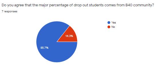 The result shows a majority of respondents which is 85.7% agree that the B40 community contributes to the drop out issue. Therefore, EduSmart project focuses on the B40 group to tackle this issue.