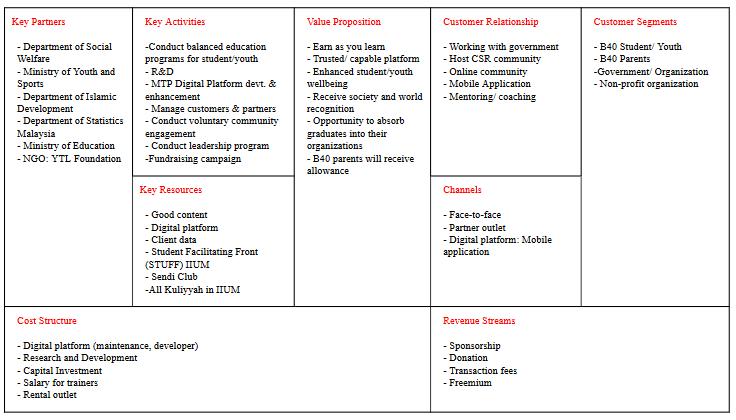 Key resources are the asset of this IT project to sustain the business. This project needs client data in customer segments, particularly for underprivileged families. The competent strategy needed to market this project to the potential customer segments and key partners. Meanwhile, a good content and functional digital are the significant factors in digital platforms to deliver value to key partners. Student facilitating front (STUFF) club and SENDI club are the important internal communities that deliver the key activities to the customer segments. The main objective of the STUFF club is to produce great leaders in the future. It provides leadership and training programs to students which benefit them to gain soft skills. Meanwhile, SENDI club focuses on mentoring and facilitating programs to primary schools. It helps strengthen the students‟ personality. All kuliyyahs in IIUM contributed in terms of providing a training team for students/youth. All kuliyyah works along with STUFF and SENDI club to develop students‟ social skills.