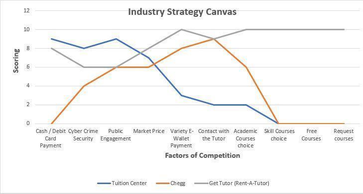 The SC is an indicator and an action framework for getting clearer view about Rent-A-Tutor in comparison with other online education platforms. It graphically captures in one simple current strategic landscape the future achievement for an organization. The competitive factors are Cash/Debit Card Payment, Cyber Crime Security, Public Engagement, Market Price, Variety E-Wallet Payment, Contact with the Tutor, Academic Courses, Skill Courses, Free Courses, and Request Courses.