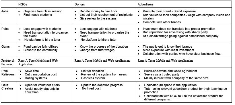 VPC is used to find customer’s pain and gain as well as expected jobs-to-do by each customer segment. This model provides them with relevant products/service (i.e. Rent-A-Tutor) as pain relievers and gain creators.