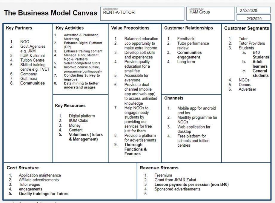 There are 7 customer segments that Rent-A-Tutor will cater to; with the main customers being Tutors and Students. Tutors are divided into two segments; paid tutors in which they will be paid according to their sessions with students per hour, and volunteering tutors in which those are the ones who will not accept any kind of payment while delivering their service. Both segments have the same value to the company by sharing their knowledge and facilitating their customers. Next, Students are divided into 3 segments which are; the B40 Students, Adult Learners, and the general public. While the 3 segments of students have the same objective, which is to get education through the tutors, the B40 and Adult Learners deserve their own attention as the B40s are too poor to even afford to attend to physical courses/schools. Rent-A-Tutor allows these students to take up any sessions, with any tutors, for free indefinitely. Adult Learners deserve to be segmentized as well as because they require special attention as well. So, Rent-A-Tutor allows this segment to take up any sessions for a discounted price as long as they are eligible to do so. Skill building lessons are available to any students, especially to Adult Learners in order to encourage this segment to become their own entrepreneur or share their knowledge with others. Tutor providers, as the name suggests, are organizations or companies that will help expand RentA-Tutor user base by enlisting job seekers to become Tutors. NGOs helps expand the user base of Rent-A-Tutor as these organizations will help to find troubled students as well as job seekers and recommending Rent-A-Tutor as the platform to regain their financial stability through skill building programmes that involves Rent-A-Tutor sending its volunteering Tutors to cooperate with these NGOs. Next, Donors are those that are interested to donate financially or manpower to work in the management. Lastly, advertisers are agents that help sponsor the platform by communicating with Rent-ATutor’s users via advertisements throughout the platform.