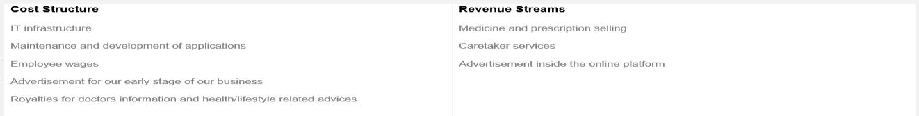 Our revenue stream will mainly come from the sales of medicine/prescription, caretaker services and other party advertisements inside our freemium application.