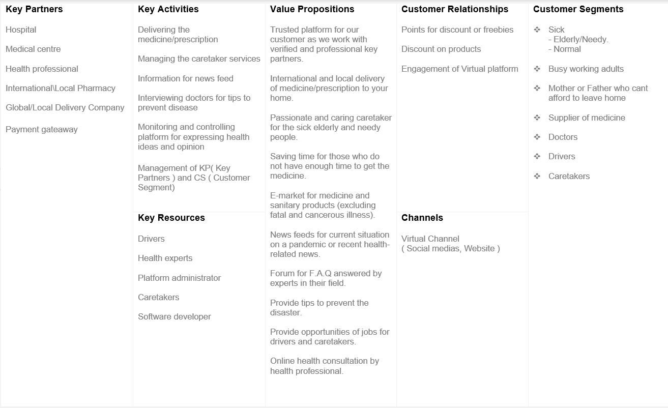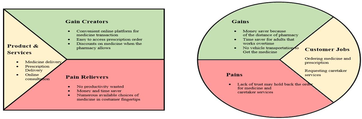 The critical proposition describes the value of products and services that our business aims to deliver, which will be offered to our customer segment. The amount varies between each customer segment which will be mainly focused on medicine/prescription delivery, Online health consultation, and caretaker services.