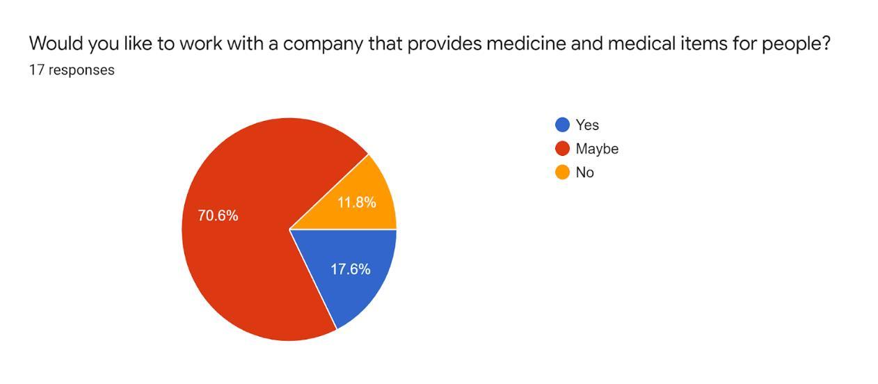 As we noticed from the statistics, the findings that we got, support our project. For the working adults, the majority of them face a lot of problems when they want to get medicine or medical products from pharmacies or hospitals, and they actively welcome the idea of this kind of service which will be a pain killer for their struggle. On the other hand, the statistics showed that many drivers would like to get a part-time job that helps them to increase their income, and they are ready to work and experience a situation like this. For the doctors, the vast majority of them gave a good impression about having a platform like this which enables them to interact and prescribe medicine for the patients.