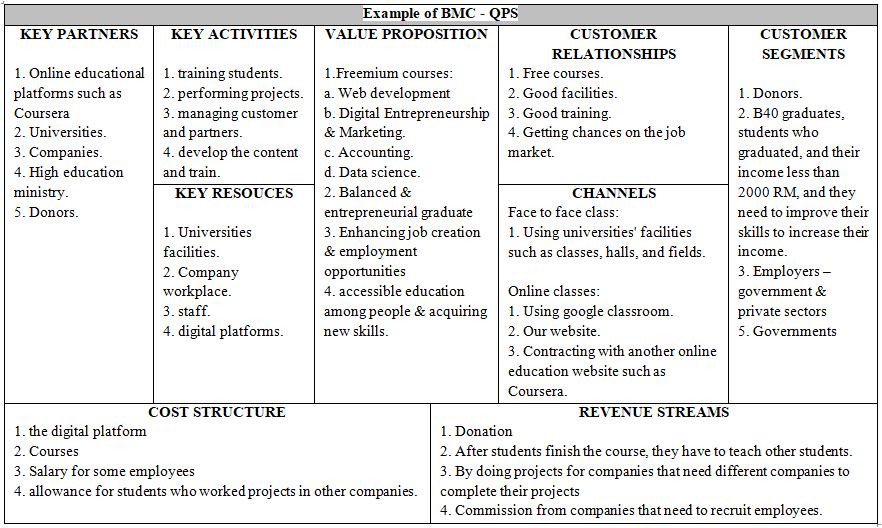 In conclusion, this conceptual solution may give certain advantages and provides new opportunities for Muslims to expand a successful business for the ummah. Allah (SWT) in the Holy Qur'an and his messenger Prophet Muhammed (PBUH) mention that Muslims have to help each other to build a robust Muslim community. Therefore, QPS ensure that this business can accomplish our value and also can meet user requirement so that QPS program can be accepted and use widely in many countries, especially in Malaysia. The QPS program could assist in offering an online educational platform for students and adult workers to learn demand courses and improve their skills. It also enables companies and organizations to recruit the proper employees for a short time. Governments will take benefits by making education accessible for all students across the country by using the QPS program. The program will offer many courses by contract with other digital educational platforms such as Coursera, Udemy, Udacity, and so on. In the future, the QPS conceptual business model is going to be realized by developing a complete business plan based on the V2MOM (Vision, Values, Methods, Obstacles, and Measures) Model. QPS program also can provide both application and web-based platforms for their users, and it will be a tool education to make knowledge more efficient and powerful for the majority of people.