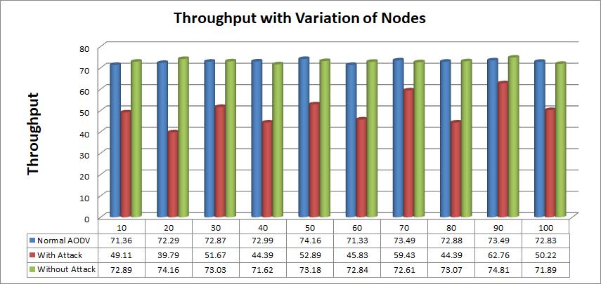 In this thesis, we have found the results with variation of nodes. In figure explain that a malicious node can bring a significant drop in the performance of the network. To study this, simulations have carried out using malicious nodes in a network, to compare it with the normal working of AODV. And also present the performance of the proposed solution that is two types of scenarios are taken into Consideration based on attacks and without attacks. In both cases there is an analysis of the effect of network performance with the variation of nodes discussed below using the graphical method.