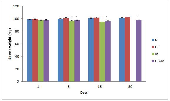 Table & Fig. II: Changes in spleen weight (mg) of normal, extract treated, irradiated and extract treated plus irradiated mice from 1-30 days period. Values are mean ± SEM; n =6 (*P< 0.05; **P< 0.01).