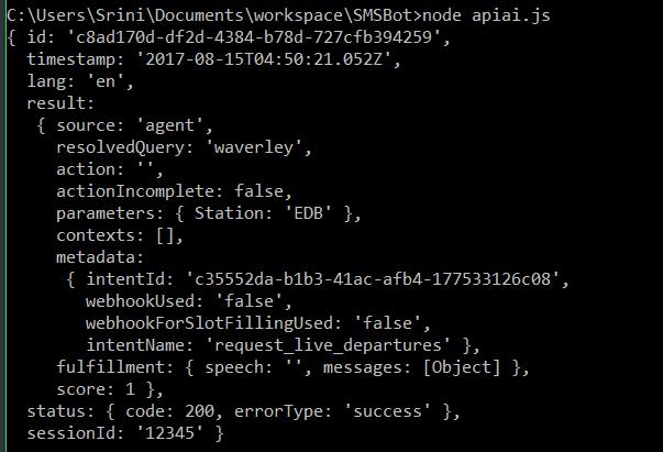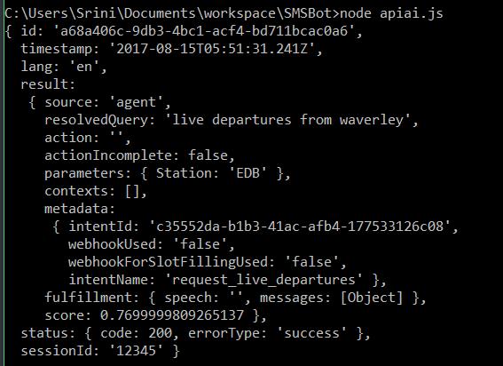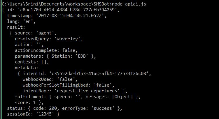 requestAPIAI.end(); 6. Run the program on the console using the node apiai.js command: 7. Observe the response displayed on the console. You will find the classified intent as intentName and associated parameters. Using these, we can fetch the appropriate information from the Transport API. And observe that there is no fulfillment speech as we did not specify any when building the intents. 8. Let's try a few more examples: change the user utterance to show me departures and run the code: