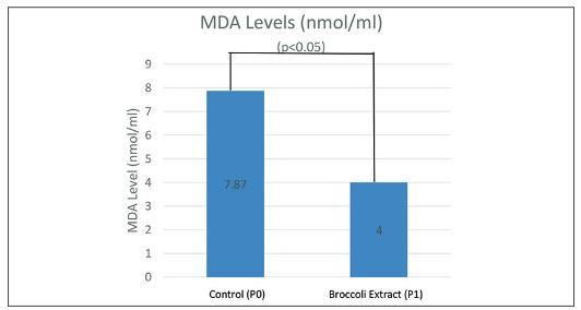An in vivo study conducted by Firi and friends in 2019 found that broccoli extract at a dose of 120 mg / 200 grBB could reduce MDA levels in 36 male Wistar rats exposed to cigarette smoke. Cigarette smoke contains many toxic chemical compounds such as tar, CO, nicotine, lead (Pb), ammonia, acetone, and so on. The collection of toxic compounds will accumulate into free radicals and form oxidative stress and trigger the lipid peroxidation process which damages the surrounding tissue. Antioxidant compounds in broccoli’s extract were able to reduce MDA levels from 7.87 nmol / ml in the control group which was only exposed to cigarette smoke to 4 nmol / ml in the group given 120 mg / 200 grBB broccoli extract with p value = 0.002. Comparison of MDA levels in the control group and the treatment group can be seen in Figure 33
