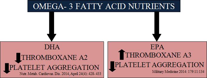 Fig 7: Role of Omega-3 nutrients as anti-platelet aggregators. DHA downregulates( ) Thromboxane A2 whereas, EPA upregulates( ) Thromboxane A3, both of which reduces platelet aggregation. Also EPA derived Prostacyclin I 3 reduces chances of bleeding (71, 72).