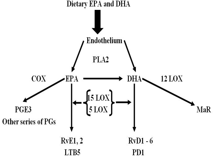 Resolvins are specialized pro-resolving lipid autacoids mediators (SPMs). They are divided into two classes i.e. EPA derived E- series (RvE1, RvE2, & RvE3) & DHA derived D- series (RvD1, RvD2 & RvD3) (Fig 2) (14). Resolvins reduce inflammation by blocking trans endothelial migration, regulate interleukin 12 production & lead to resolution of the inflammatory response to resolve inflammation. Resolvin molecules do not inhibit the onset of inflammation but stimulate its resolution pathways. They promote the resolution of the inflammatory cycle. They also stimulate the phagocytosis of apoptotic PMNs by macrophages and selectively disrupt thromboxane-mediated platelet aggregation.
