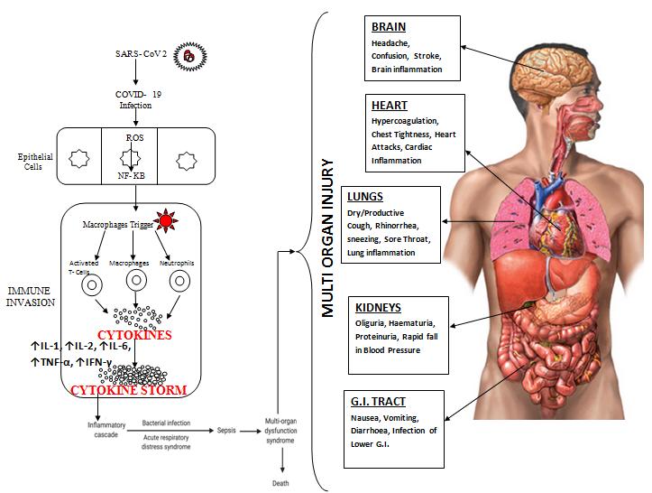 Inflammation is body‟s first line of defense against infection and injury. After its initiation it should be subsided otherwise it becomes harmful to the body. Body has its own anti-inflammatory system as well to resolve inflammation. Thrombosis & inflammation go hand in hand in COVID-19. They become injurious to the host in direct proportion to the disease severity if it remains unchecked (12). Ruptured type-2 pneumocytes attract macrophages through production of host defense mechanisms which include proinflammatory cytokines such as interleukin (IL)-1β, IL-6, tumor necrosis factor-α (TNFα), & complement system proteins, all of which specifically raised IL-6 can induce coagulopathy (13). This can lead to endothelial dysfunction, vascular damage, sepsis, hypercoagulation & multi organ injury i.e. Brain, Heart, Lungs, Kidneys and G.I. Tract (Fig 1)
