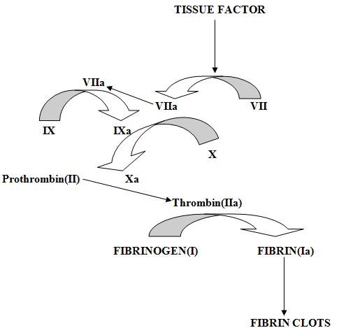 Fig 4:- Tissue factor (TF) (also called as platelet tissue factor, factor III & CD142) released in response to the cytokines like IL-1, TNFα & endotoxin leads to coagulation. Increase in tissue factor results in activation of coagulation cascade by activating factor VII to VIIa which further activates other coagulation factors like IX & X to IXa & Xa respectively & subsequently form thrombin & fibrin.