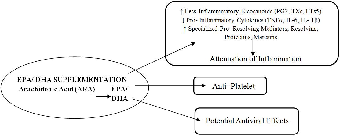 Omega- 3 fatty acids (EPA + DHA) supplementation exerts their anti- inflammatory actions by competing with omega- 6 (Arachidonic Acid), reducing pro- inflammatory eicosanoids and increasing proresolvins (Fig 8) (78). Aspirin induces synthesis of Resolvins & the Protectins with the help of EPA and DHA (79, 80, 81 and 82). A combination of aspirin & omega-3 PUFAs (EPA + DHA) is an effective prevention strategy in cardiovascular diseases. Aspirin, EPA and DHA combination not only prevents the onset of inflammation but also resolves it (83).