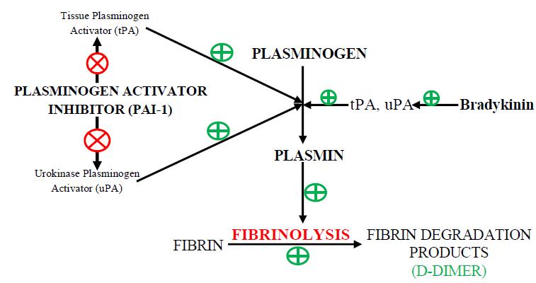 Fig 3 : (A) Generation of plasmin, the fibrinolytic enzyme, follows the activation of plasminogen by plasminogen activators (PA; tissue-type PA [tPA] & urokinase-type PA [uPA]), which are themselves inhibited by type 1 plasminogen activator inhibitor (PAI-1). The enzymatic activity of plasmin is inhibited by 2-antiplasmin (2-AP; & potentially by 2macroglobulin) (21). (B) The direct infection of endothelial cells by the virus (a mechanism that is rather specific for coronaviruses via their cell entry through ACE2 (angiotensin-converting enzyme 2, the receptor for SARS-CoV-2), abundantly expressed on endothelium) leads to a massive release of plasminogen activators (22). ACE2 helps to mediate anticoagulant properties of the vascular endothelium in the healthy state, binding of SARS-CoV-2 to ACE2 aggravates cell damage, upregulates tissue factor expression (23). SARS- CoV- 2 binds to the ACE -2 Receptor which is an important Component for Renin Angiotensin System. Due to overusage of ACE 2, it will result in excess of Angiotensin 2 which is stimulator of PAI-1; this inhibits the action of Plasminogen activator which helps in fibrinolysis by converting Plasminogen to Plasmin.