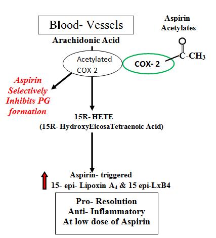 COX-2 plays a dual role in inflammatory process, i.e. pro-inflammatory and anti-inflammatory (Resolution). In the inflammatory phase COX-2 promotes generation of pro-inflammatory lipid mediators from Arachidonic Acid like prostaglandins (PGs) and leukotrienes (LTs) and in the anti- inflammatory phase, it promotes generation of pro- resolvins from Omega- 3 fatty acid nutrients (EPA & DHA). This depends upon presence or absence of aspirin. EPA + DHA are the necessary building blocks of resolvins. On the contrary, Omega- 6 (AA) generates pro- inflammatory eicosanoids. Using the same COX and LOX enzymes operative during the initiation of acute inflammation, the host is able to shift the chemical mediator profile from pro-inflammatory to pro-resolving by modulating biosynthetic pathways to induce 15LOX expression and activity to generate LXs, RVs and PD1.