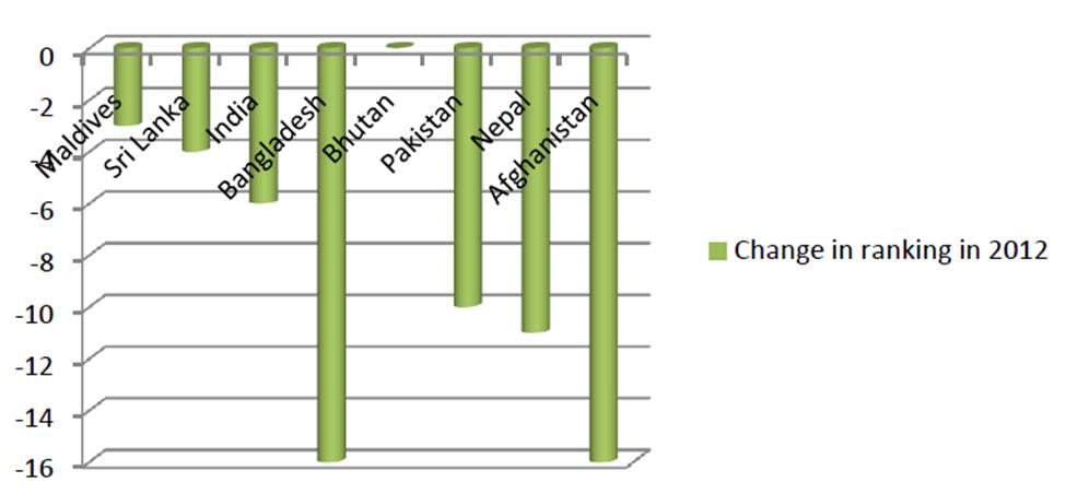 All South Asian countries performed much better in 2012 than in 2010, except Bangladesh and Afghanistan, according to the table and the graph. In its index, the Maldives, followed by Bhutan, Sri Lanka, India, Nepal and Pakistan, had the highest rise. On the other hand, in its e-government growth index, Afghanistan had the greatest decline of around 19 percent. Bangladesh (1.22%) did not have a major fall, of course. If the regional and global averages are compared, however, it can be seen that, on the other hand, the world had an 11% rise, while the SAARC region had an increase of just 5%. But the fact is that, compared to 2010, Bangladesh declined in 2012, instead of increasing. The change in ranking of SAARC countries in e-government development index is shown in the following chart.