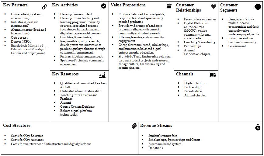The value proposition section of the canvas describes the services and products that the university delivers that are of value and satisfies the needs and expectations of the different customer segments. They include producing balanced graduates who are knowledgeable in various academic fields aligned with the community’s and industry’s needs, who are responsible and possess digital entrepreneurial knowledge and skills to create jobs. Freemium-based courses and scholarships for students and unemployed graduate youths from Bangladesh’s low-middle income communities. Providing ICT and engineering solutions through student projects and researches for issues commonly found in lowmiddle income communities (e.g. ICT solutions for agriculture, health tracking and monitoring, clean water solutions, etc.). The principal goal is to provide current and relevant education and solutions to reduce unemployment which helps to reduce poverty and hunger. Educated with digital entrepreneurial skills, youths possess better employability skills for industry jobs as the country is currently transitioning into a digital country. Furthermore, the youths are capable of creating their own businesses and scaling them up to create more job opportunities for other members of the community and government.