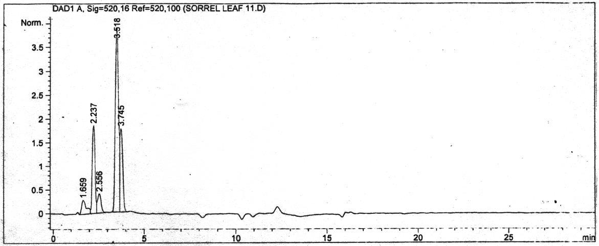 Calyxes and leaves provided five retention times each, with three distinct peaks in calyxes and five in leaves. Concentrations were lower in leaves based on absorbance (Figure 1,2). Seeds had no chromatographic response. The presence of anthocyanins in sorrel calyxes and leaves based on methods adopted correlates to anticancer properties as observed locally and reported in many studies and may play a part as anti-inflammatory and as chemo-preventative agents since anthocyanins such as cyanidin and delphinidin were reported to inhibit epidermal growth factor receptor in cancer cells. The seeds did not show any compounds that were of benefit apart from those that reported earlier20. These results showed that sorrel calyxes and leaves possess compounds that are important in addressing various health problems. This study shows that sorrel calyxes, seeds, and leaves have potential health benefits that may help in the prevention and treatment of diseases and that mitigation might be necessary to maximize heath potential.