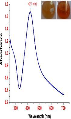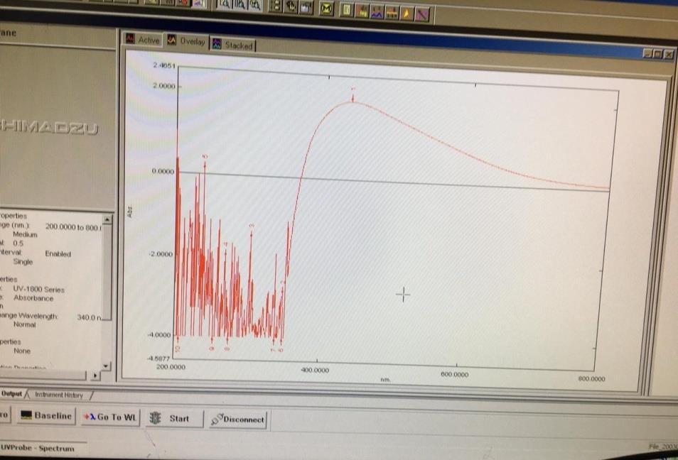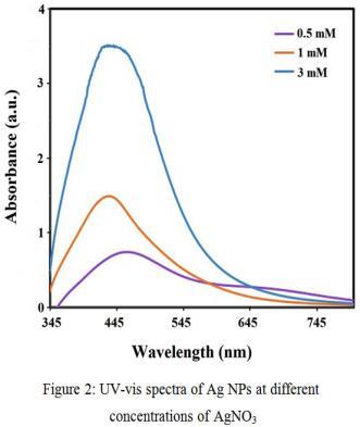 UV-vis spectroscopy is a very useful and easy technique for the primary characterization of synthesized Nanoparticles which is also use for monitoring the synthesis and stability of AgNPs. AgNPs has separate optical properties, which make them strongly interact with particular wavelengths of light. In addition, UV-vis spectroscopy is fast, easy, simple, sensitive, and selective for selective types of NPs, needs only a short time for dimensions and final calibration is not required for particle characterization of colloidal homogeneous solution. In AgNPs, the conduction band and valence band is very close to each other in which electrons move freely. Free electrons give to a surface Plasmon resonance (SPR) occurring due to the oscillation of electrons of silver nano particles in resonance with the light wave. Absorption of AgNPs is depending on the particle size, medium, and chemical properties. So UV- Vis spectroscopy is very useful and easy technique for analysis of different Nanoparticles [.2]